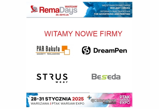 Z radością prezentujemy nowych wystawców, którzy dołączą do grona blisko 400 firm na jubileuszowej, 20. edycji Międzynarodowych Targów Reklamy i Druku RemaDays, odbywających się w dniach 28-31 stycznia 2025 w Ptak Warsaw Expo