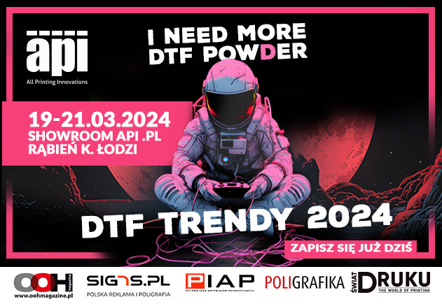 W dniach 19-21 marca 2024 r API.PL organizuje spotkania DTF TRENDY 2024. Event dedykowany jest producentom odzieży, drukarniom, które chcą produkować transfery DTF, firmom, które pragną rozszerzyć swoje możliwości realizacji zleceń inwestując w nową technologię.