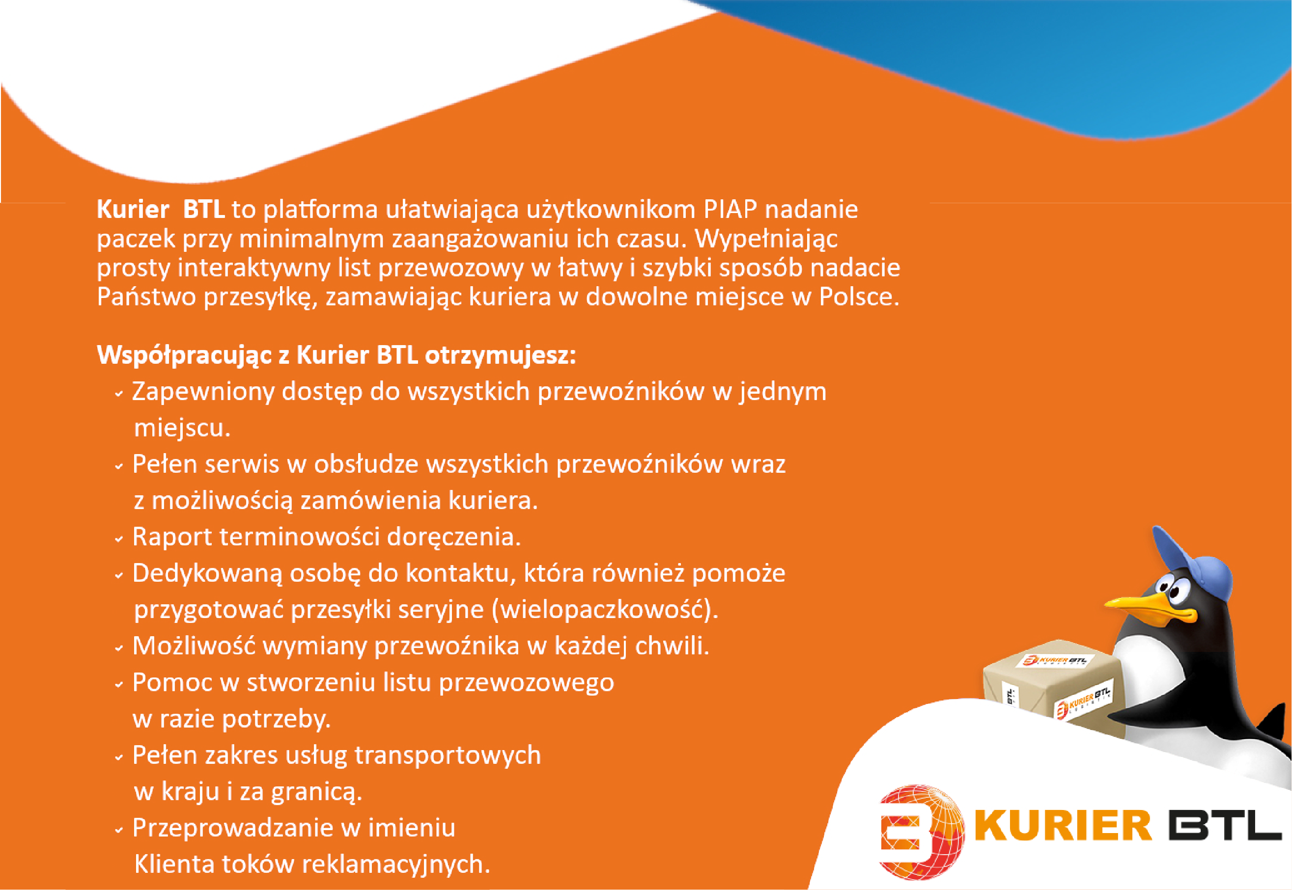 Kurier BTL to platforma ułatwiająca użytkownikom PIAP nadanie paczek przy minimalnym zaangażowaniu ich czasu. Wypełniając prosty interaktywny list przewozowy w łatwy i szybki sposób nadacie Państwo przesyłkę, zamawiając kuriera w dowolne miejsce w Polsce.